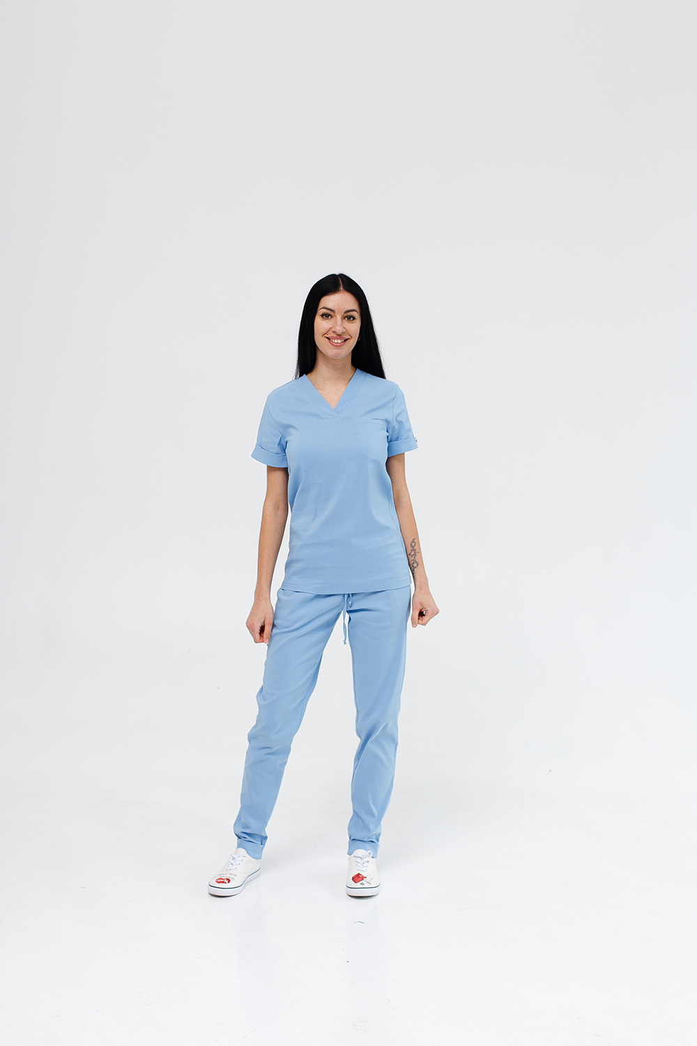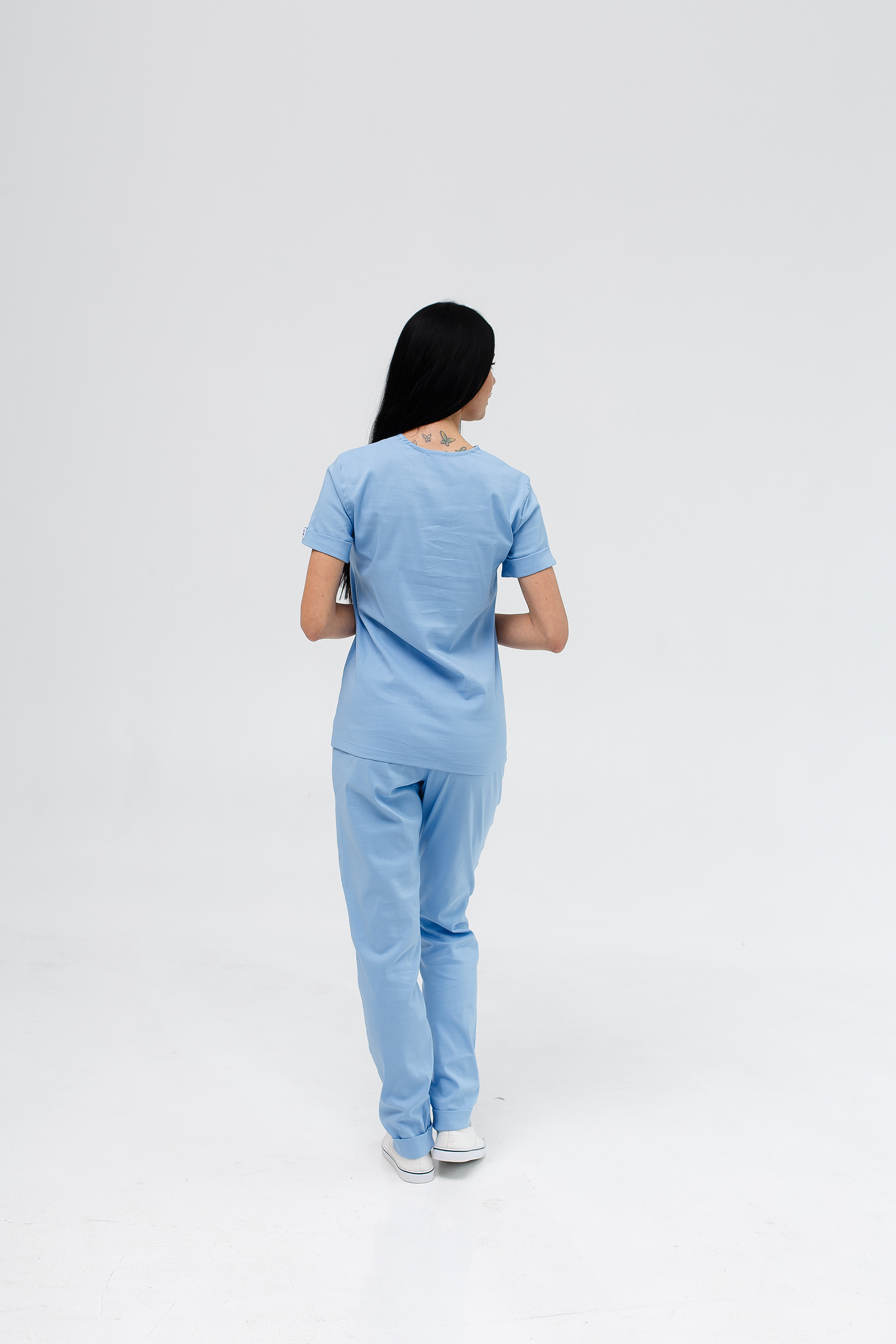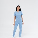 Strój składa się z chirurgicznej koszuli o prostym kroju oraz spodni. Koszula z krótkimi rękawami i dekoracyjnymi mankietami, wyposażona w kieszeń-wszywkę. Spodnie, zwężane ku dołowi, z wszytymi kieszeniami, o średnim stanie, z troczkiem w pasie na gumce do regulacji talii. Tkanina Premium Cotton o wysokiej zawartości bawełny i włókien lycry. Lekki i wygodny model zapewnia maksymalny komfort podczas pracy i pozwala skórze oddychać.