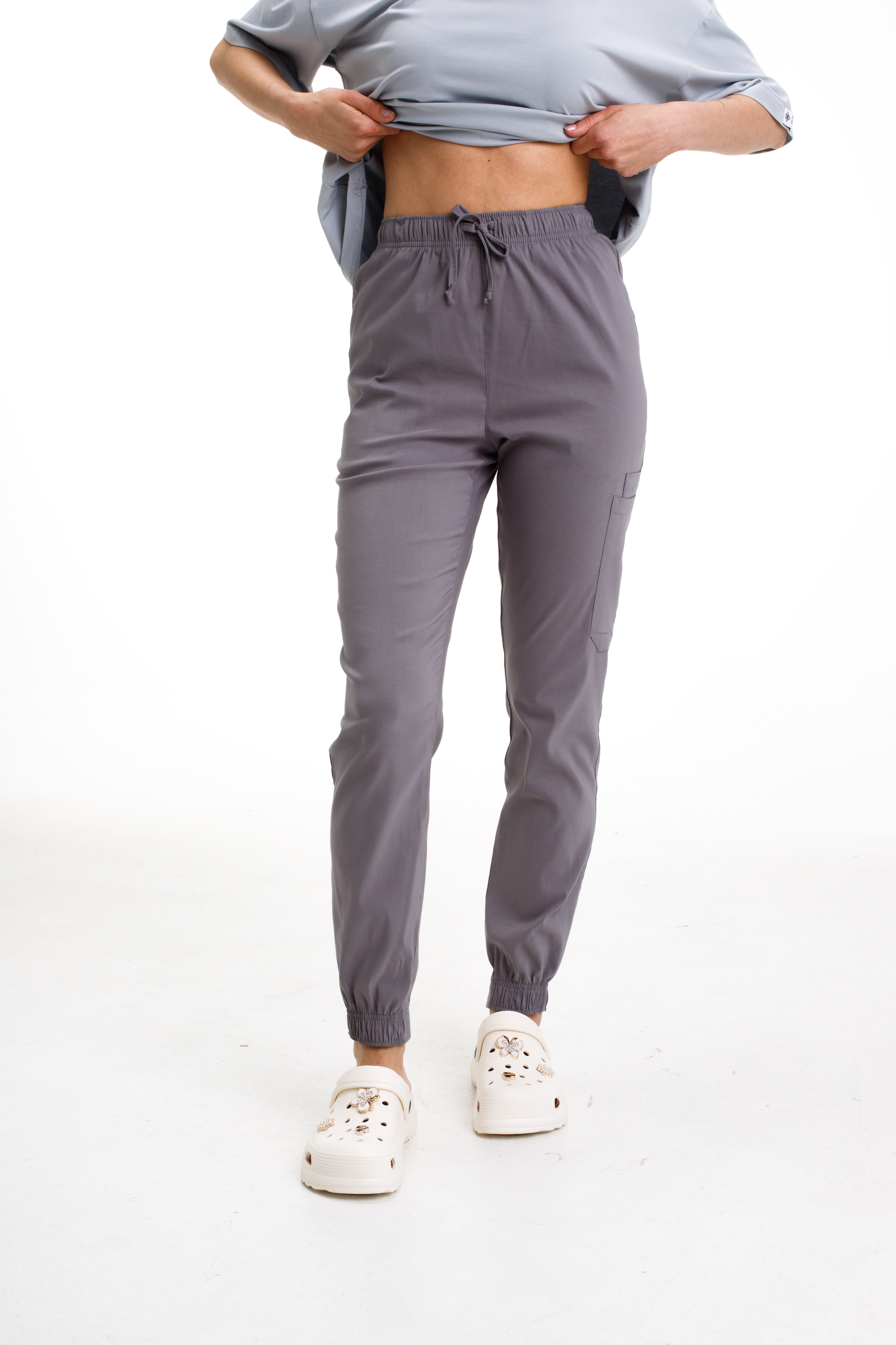 Joggery mają pas z elastyczną gumką i troczkiem do regulacji talii oraz 5 pojemnych kieszeni. Model wykonany jest z tkaniny premium o wysokiej zawartości bawełny.