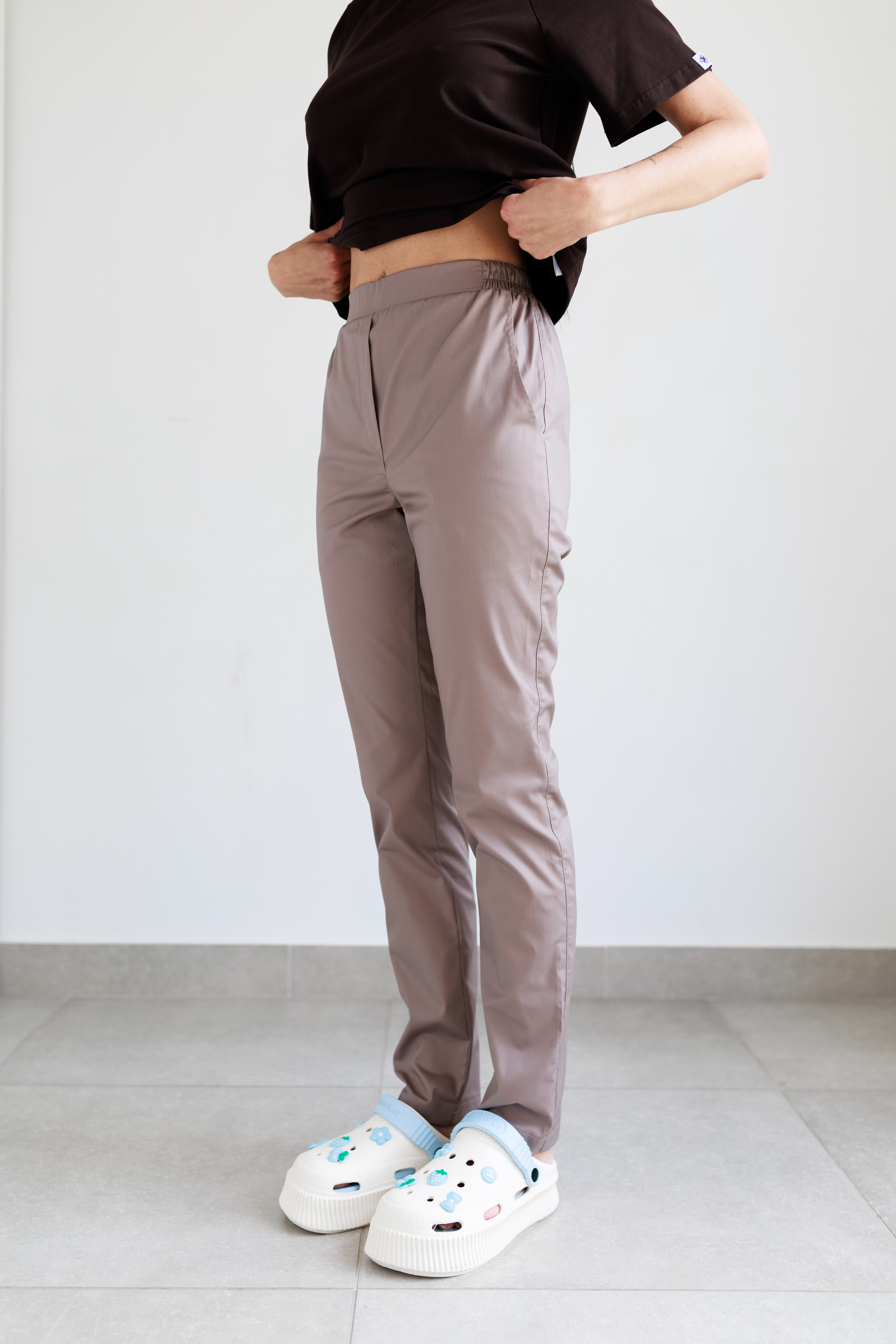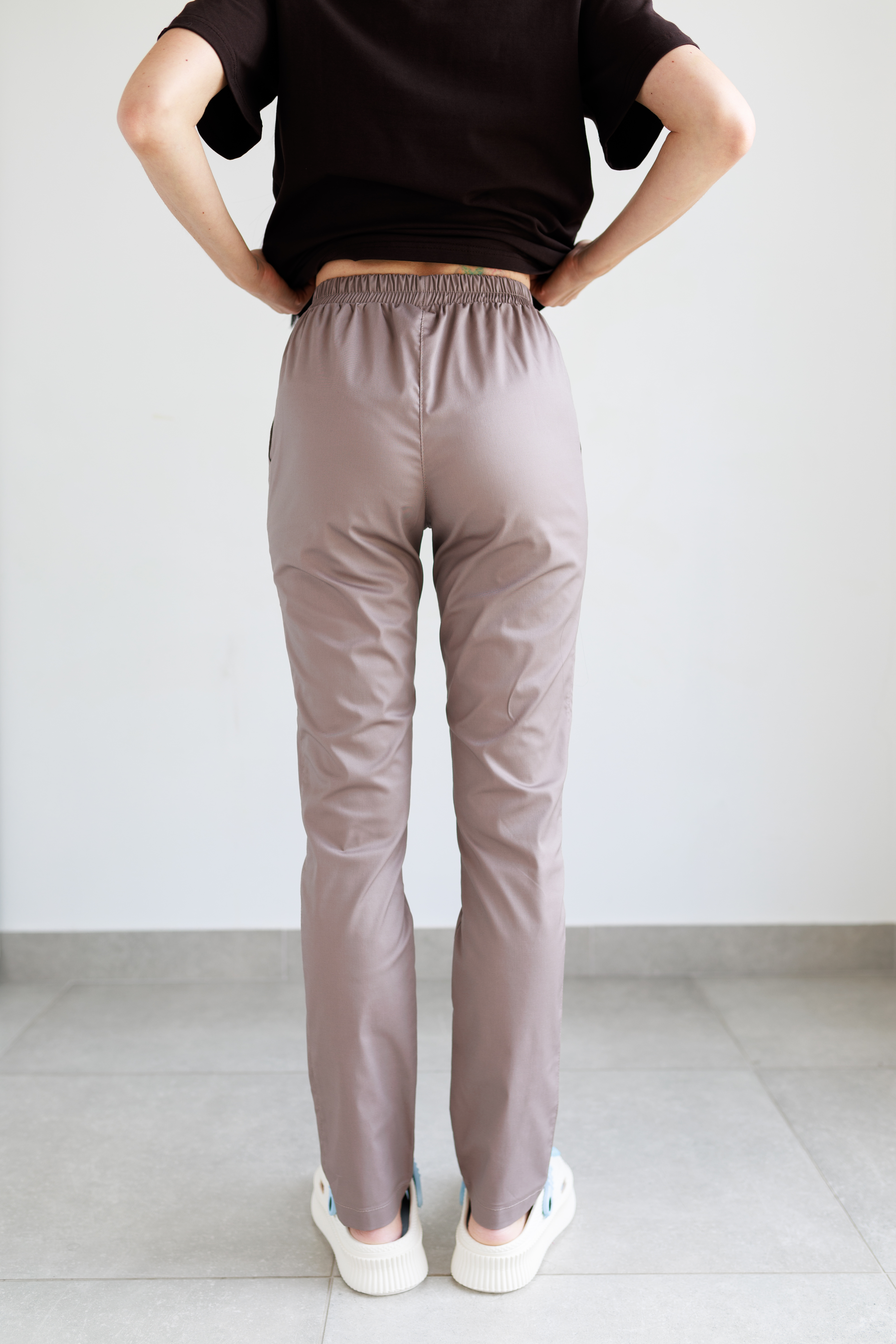 Spodnie mają wysoki stan, prosty krój, pas na elastycznej gumce i dwie kieszenie.