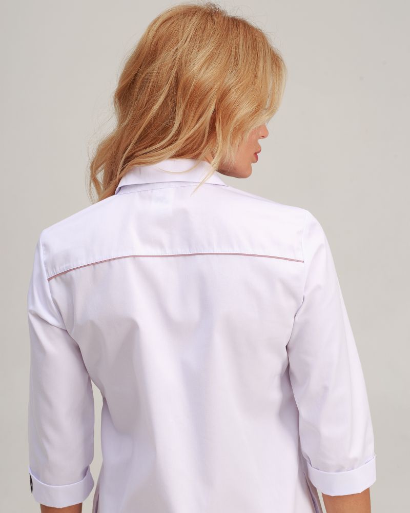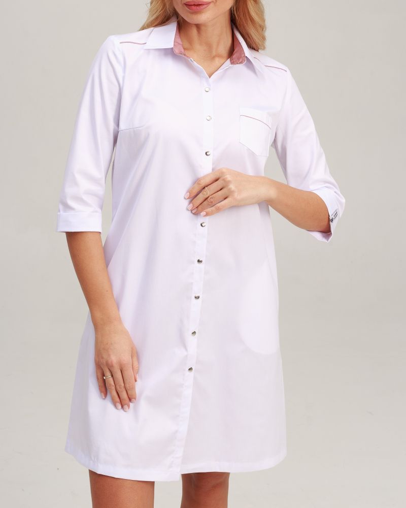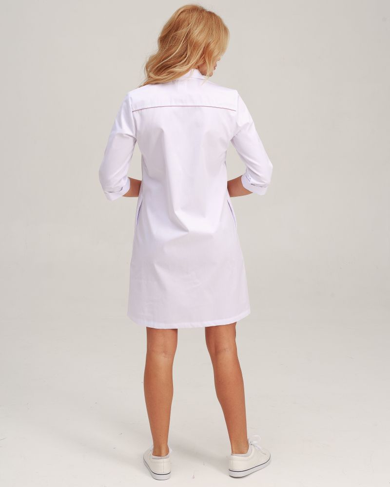 Posiada trzy kieszenie – jedną piersiową i dwie boczne. Fartuch zapinany jest na szereg guzików. Kołnierz szlafroka damskiego ma kształt stójki i wywijanego kołnierza, stójka obszyta jest od wewnątrz kontrastowym materiałem. Rękawy są czteroczęściowe, jednoszwowe, wszyte, z mankietem.