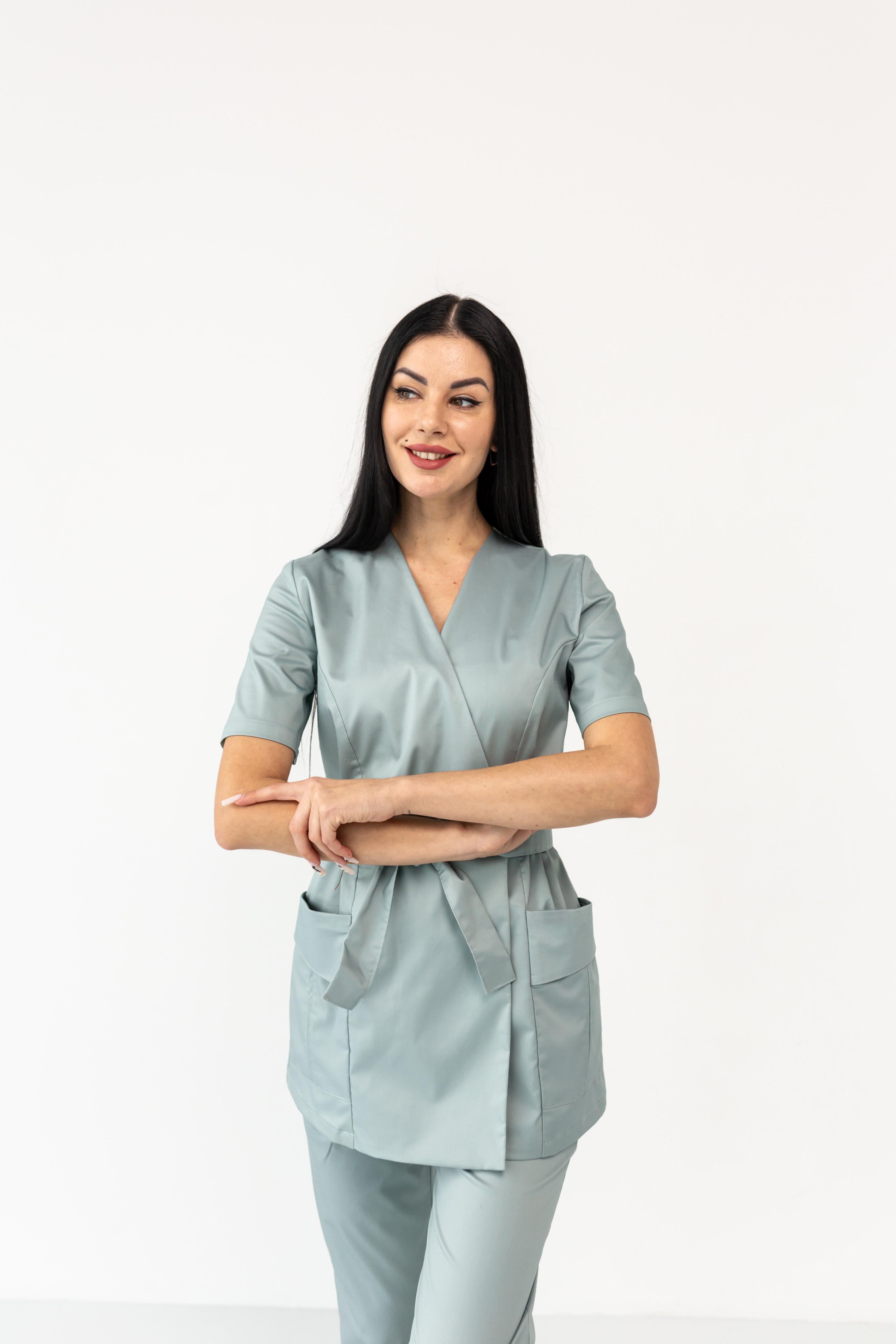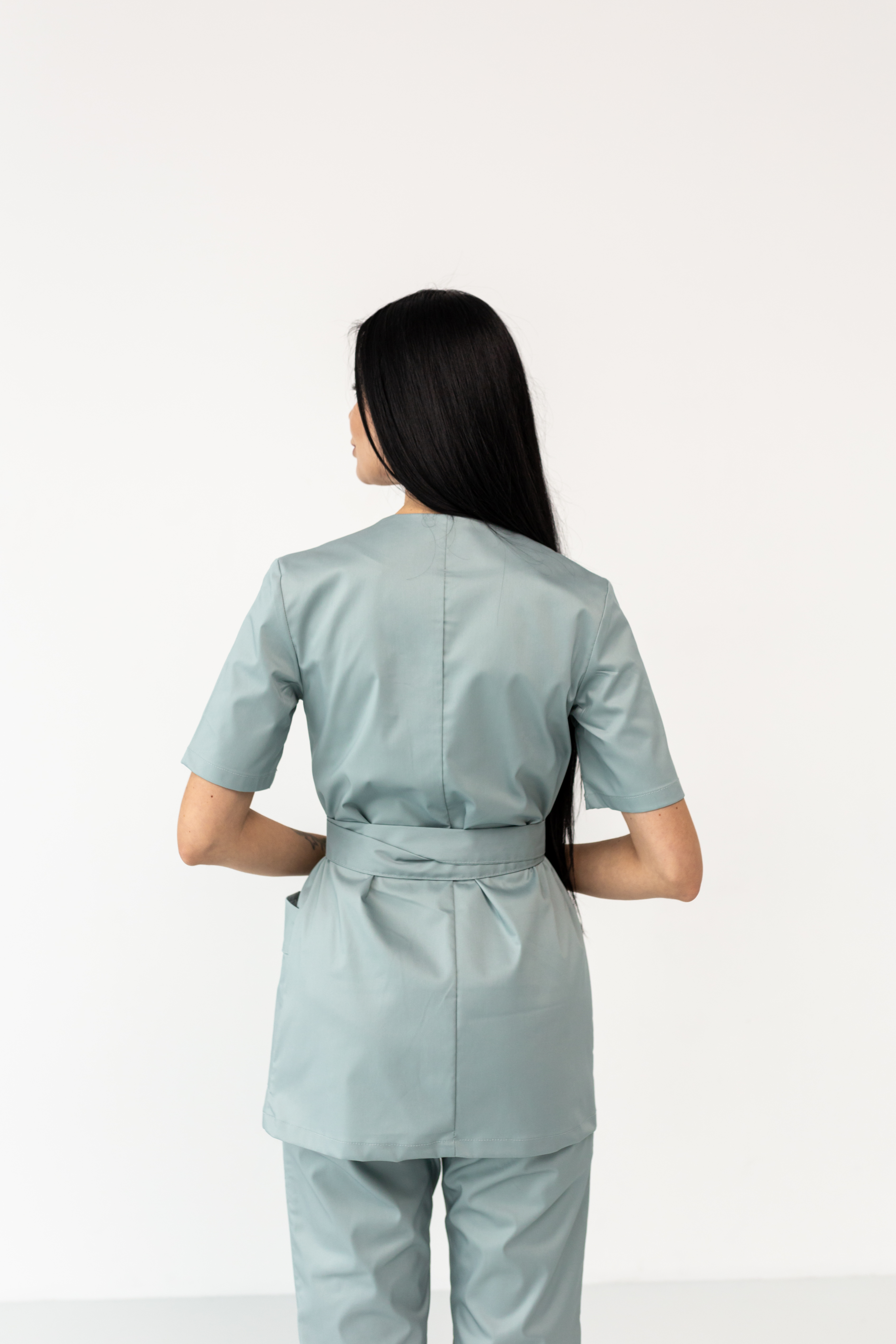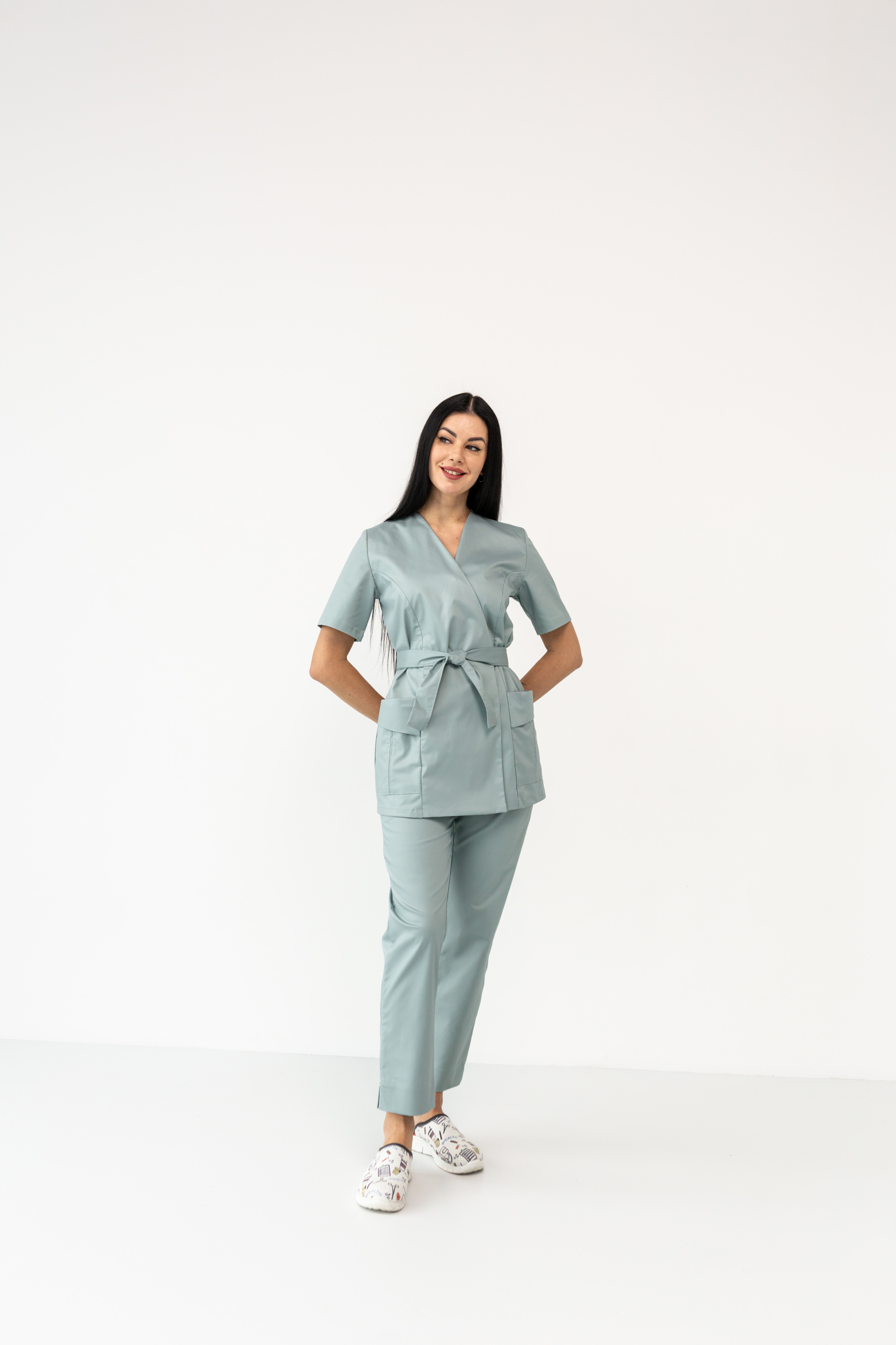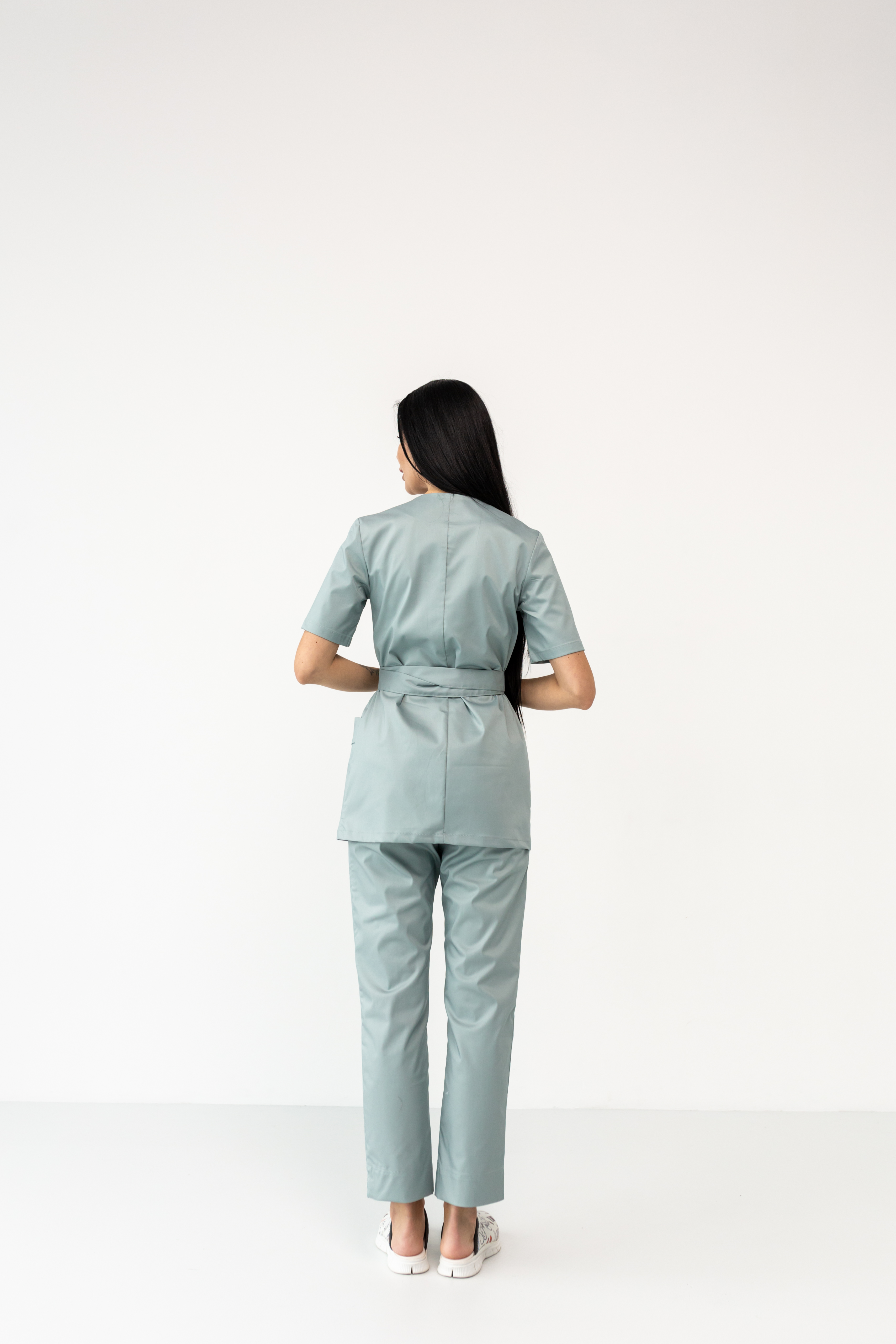 Komplet o dopasowanym fasonie. Bluza kopertowa, z krótkim rękawem, naszywanymi kieszeniami, oraz naszywanym szwem na plecach. Spodnie o prostym kroju, wyposażone w kieszenie, pasek i rozcięcia boczne. Komplet łączy w sobie wygodny krój z tkaniną zawierającą elastan.