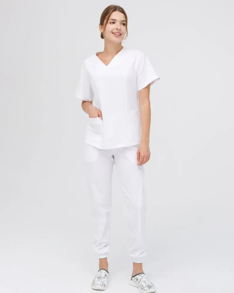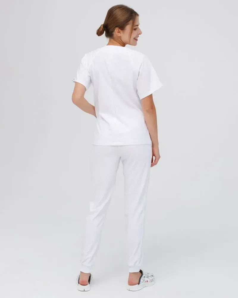 Medyczny zestaw damski „Arizona” składa się z koszuli z krótkim rękawem oraz spodni typu jogger. Koszula z dekoltem w kształcie litery V, spodnie posiadają wygodną gumkę z wiązaniem. Zaletą zestawu jest elastyczny materiał premium, który nie gniecie się, a dodatkowo mocno się rozciąga.