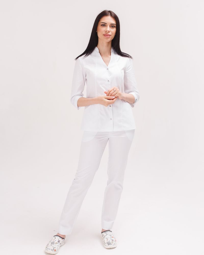 Zestaw składa się z koszuli oraz spodni. Koszula o pół przylegającym kroju z rękawam 3/4. Zapinana jest na zatrzaski, posiada także kieszeń w szwie. Spodnie z wygodną gumką w pasie.