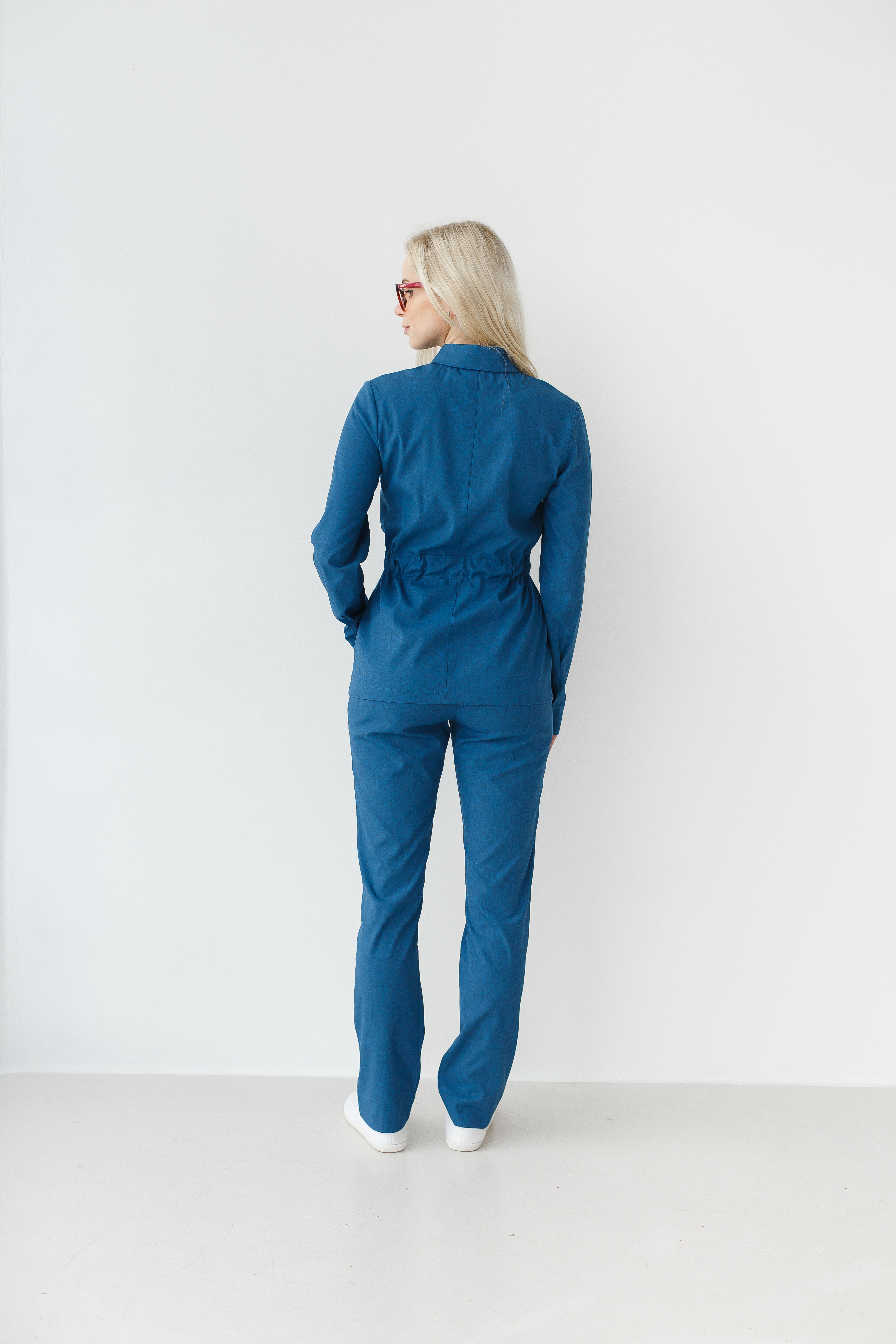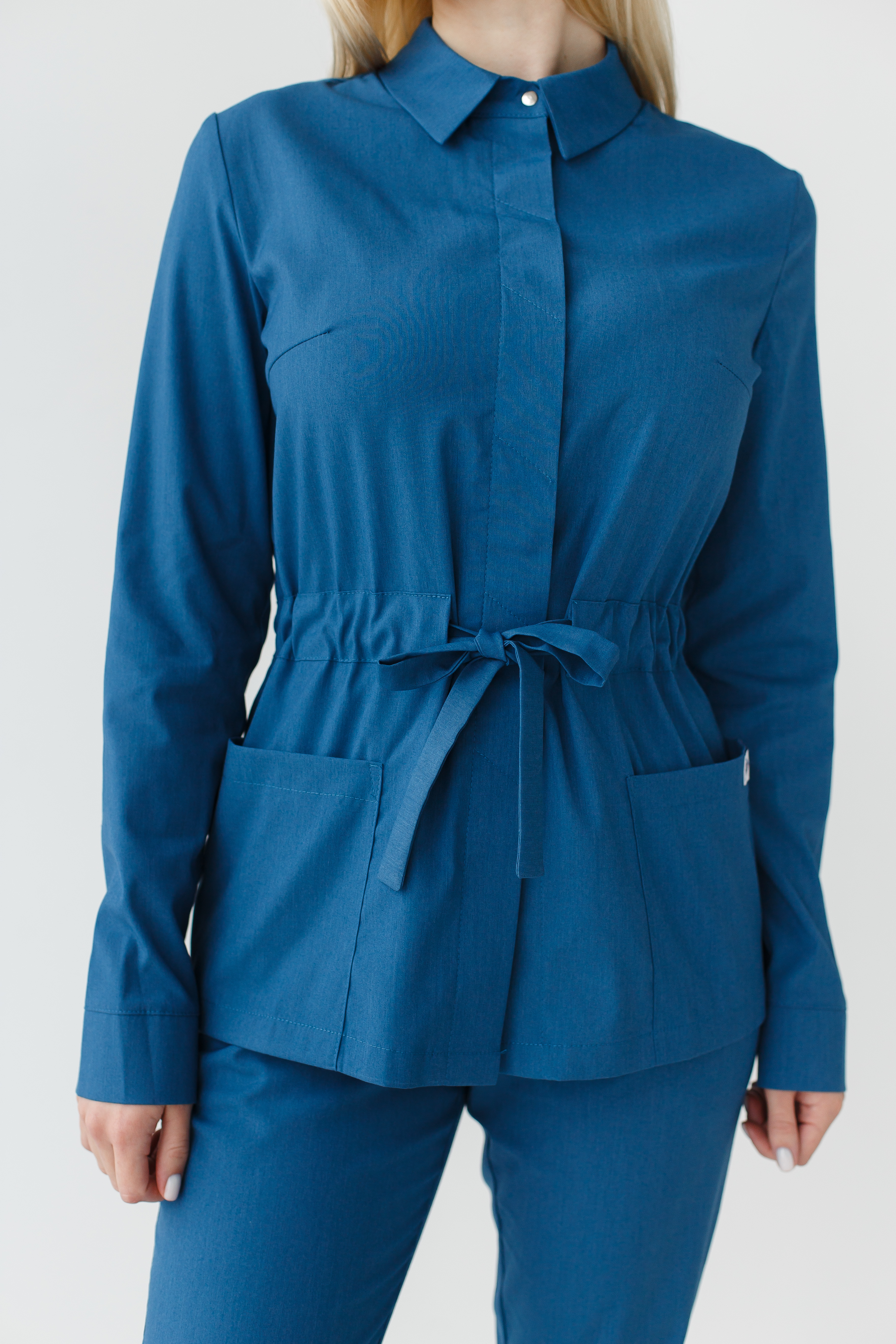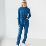 Zestaw medyczny damski składa się z medycznej koszuli na zatrzaski oraz spodni. Koszula ze stójka, posiada dwie pojemne nakładane kieszenie. Mankiety rękawów można regulować ukrytymi zatrzaskami. Elastyczny pasek podkreśla talię, nie ograniczając przy tym ruchów. Spodnie o prostym kroju z elastyczną gumką w pasie i dwoma kieszeniami.