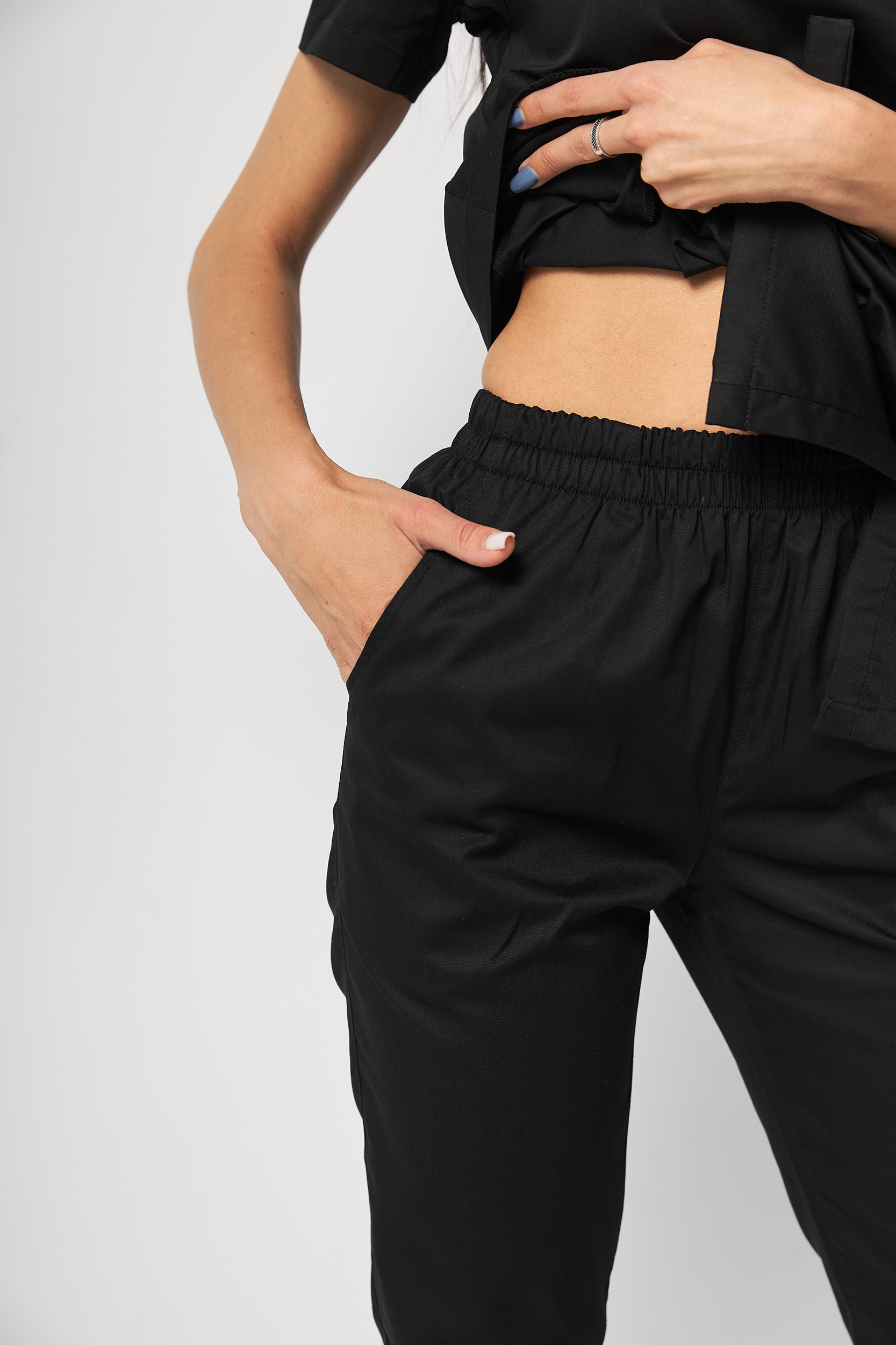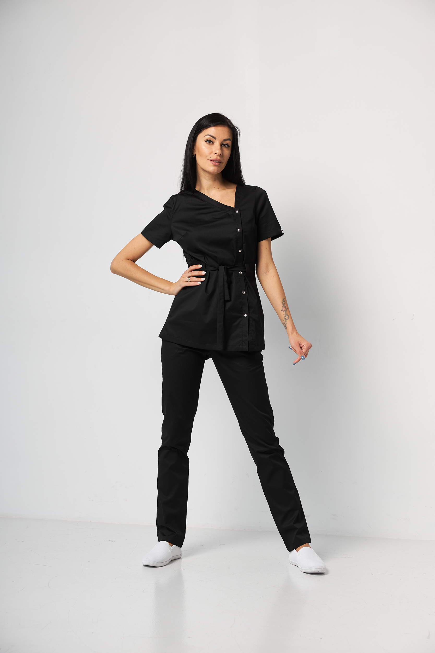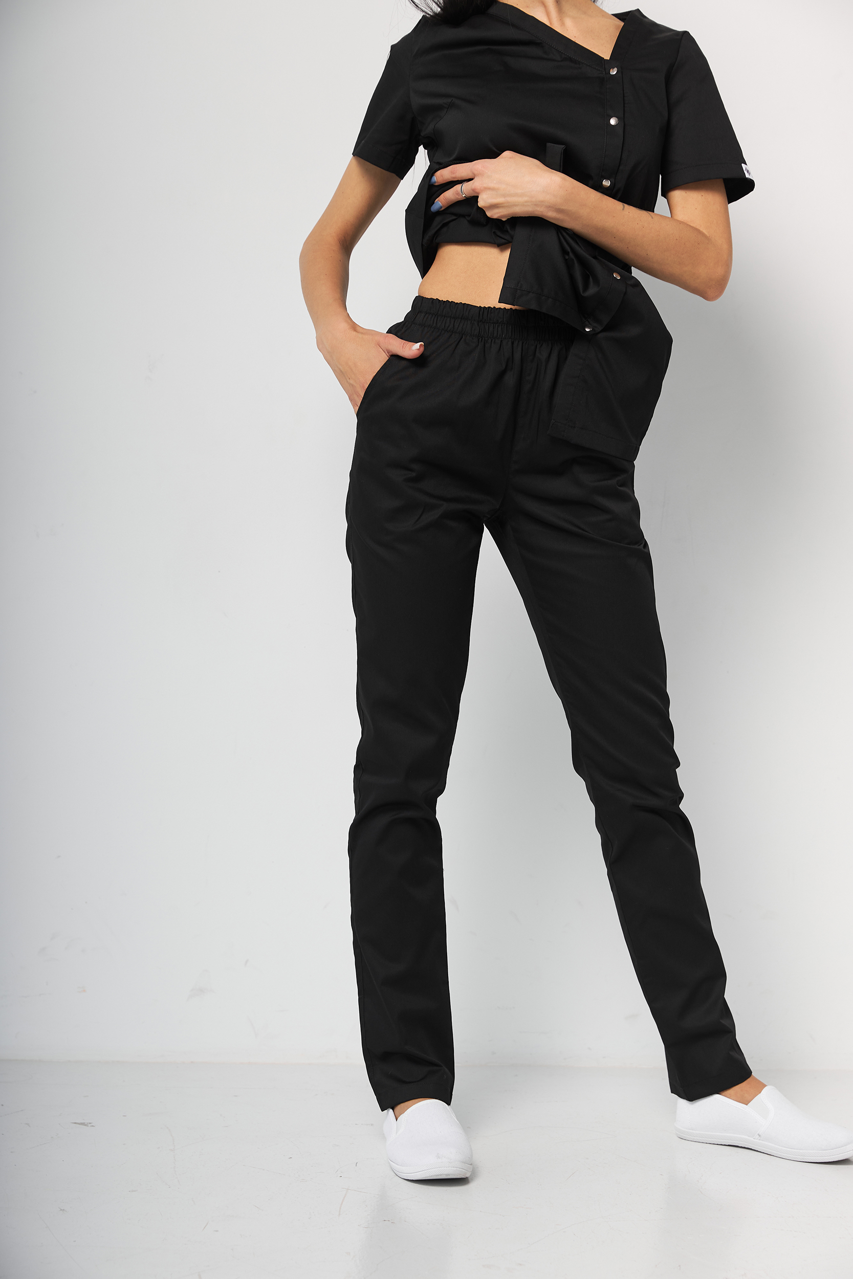 Komplet składa się z medycznej koszuli zapinanej na zatrzaski oraz spodni. Koszula ma asymetryczny dekolt, krótkie rękawy i zapięcia na zatrzaski. Talię podkreśla elastyczny pasek. Spodnie z prostymi nogawkami, elastyczną gumką w pasie oraz dwoma kieszeniami.