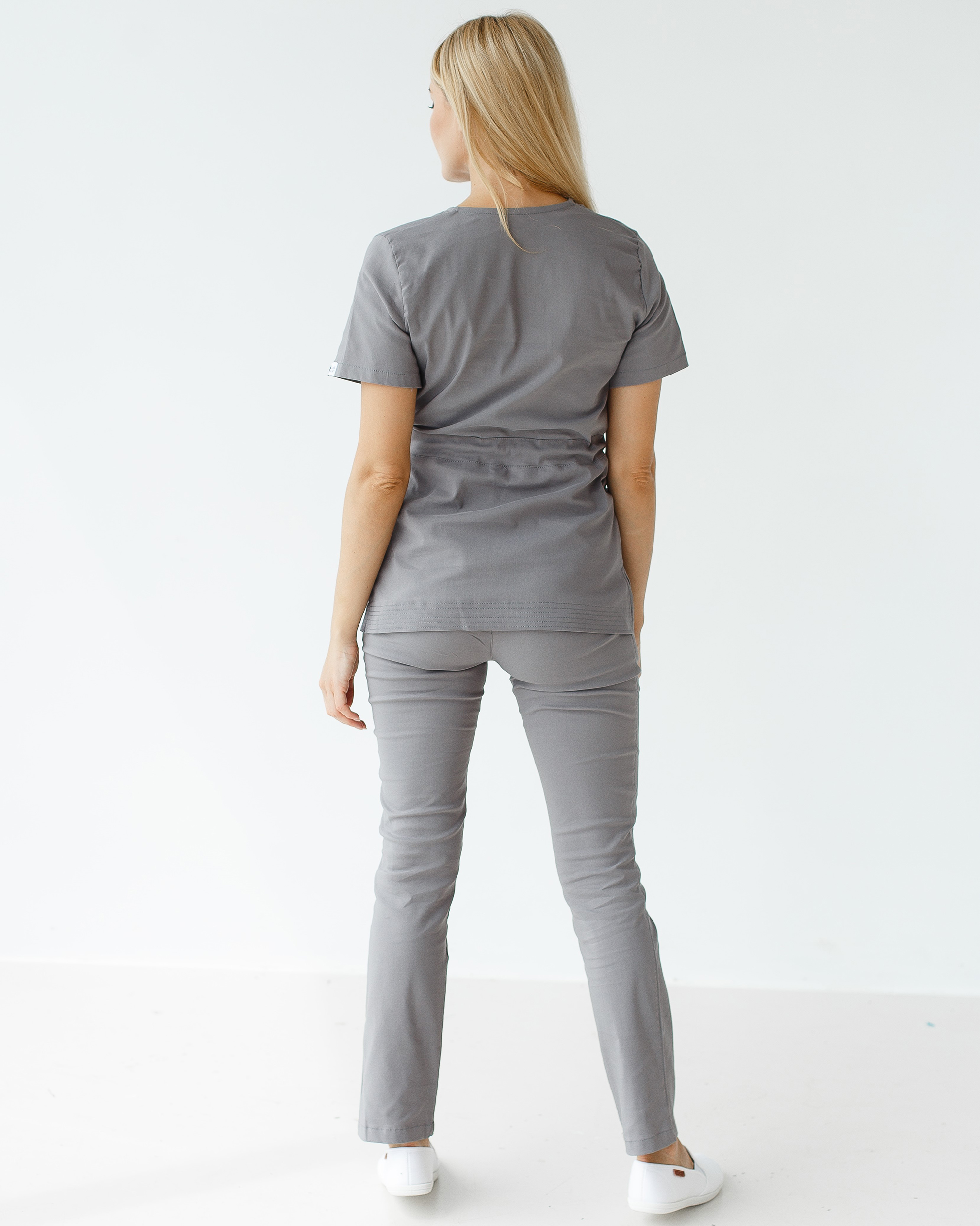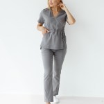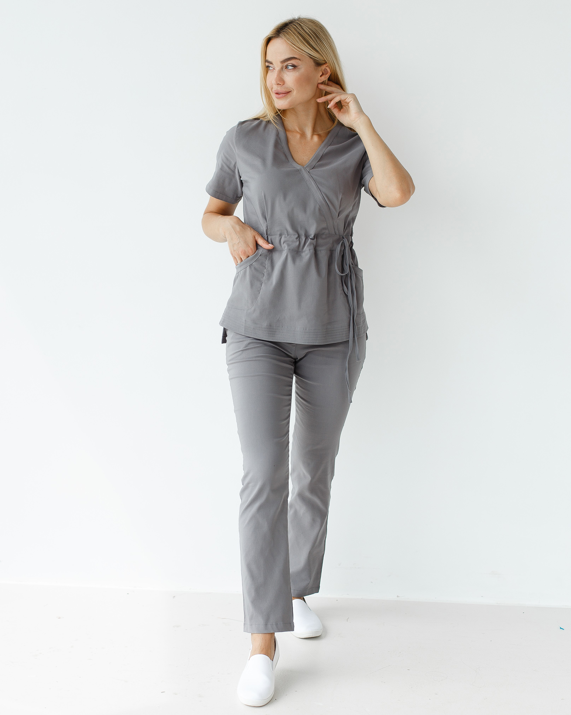 Bluza z paskiem w pasie do regulacji lepszego dopasowania. Spodnie z kieszeniami, z elastyczną gumką w pasie.