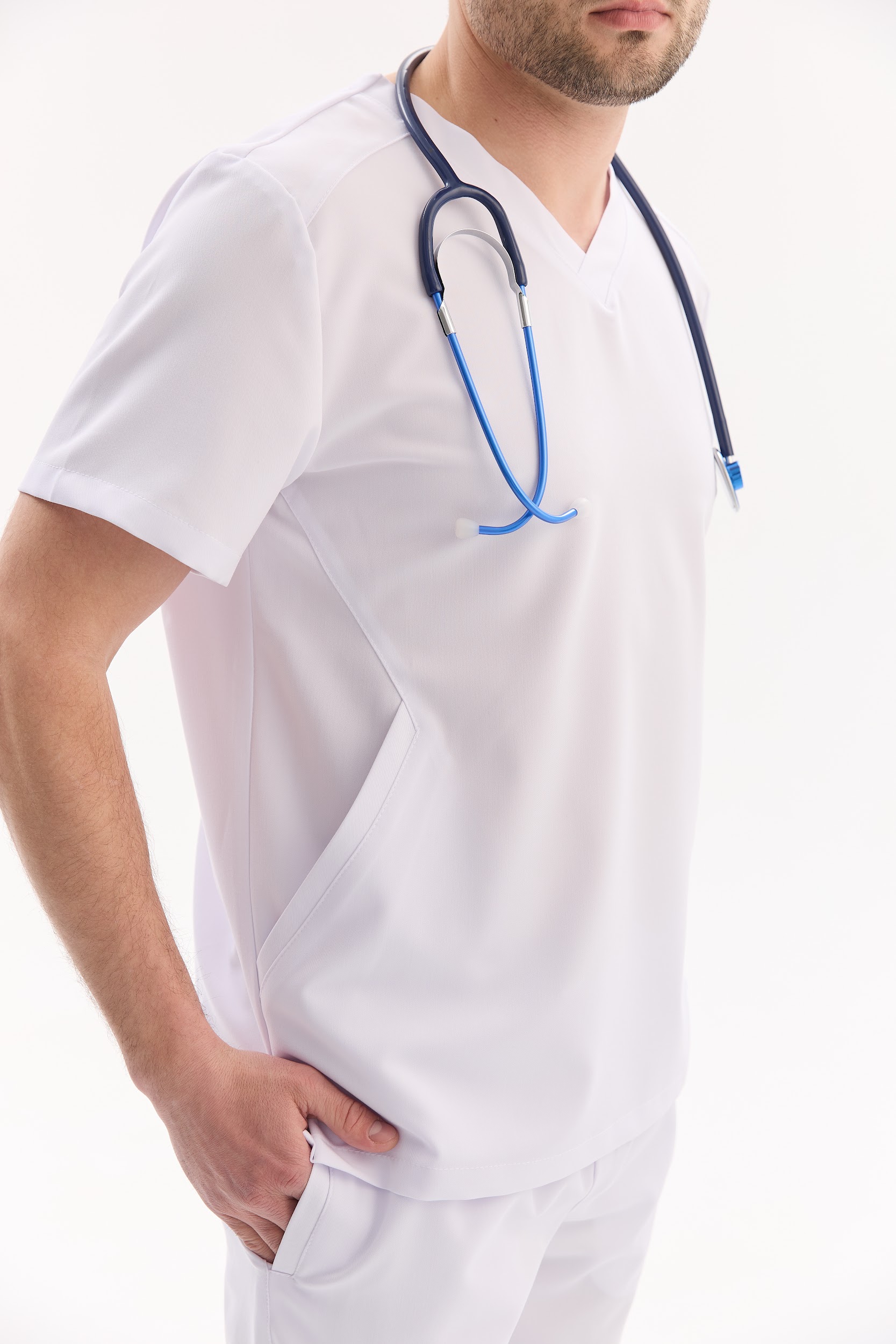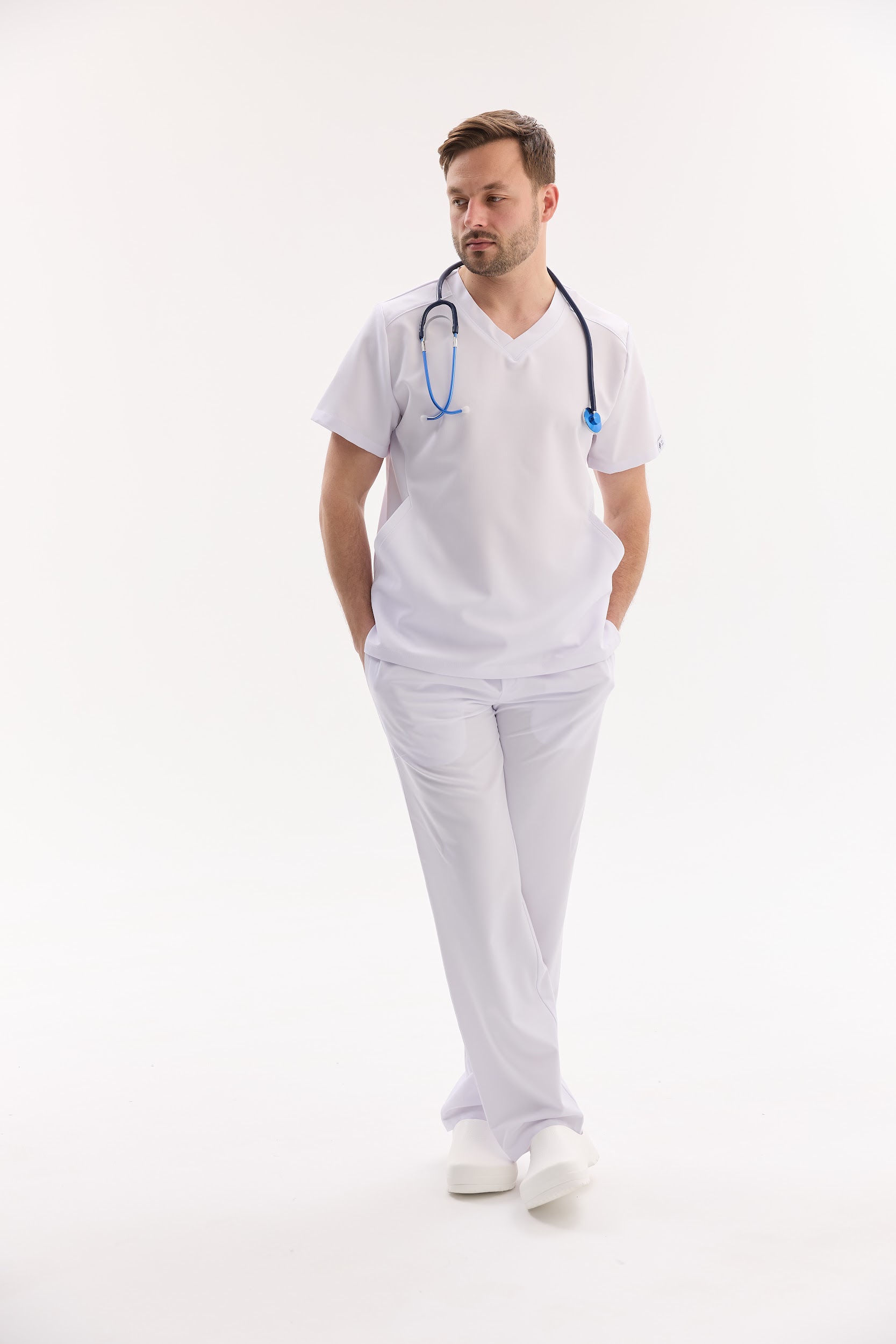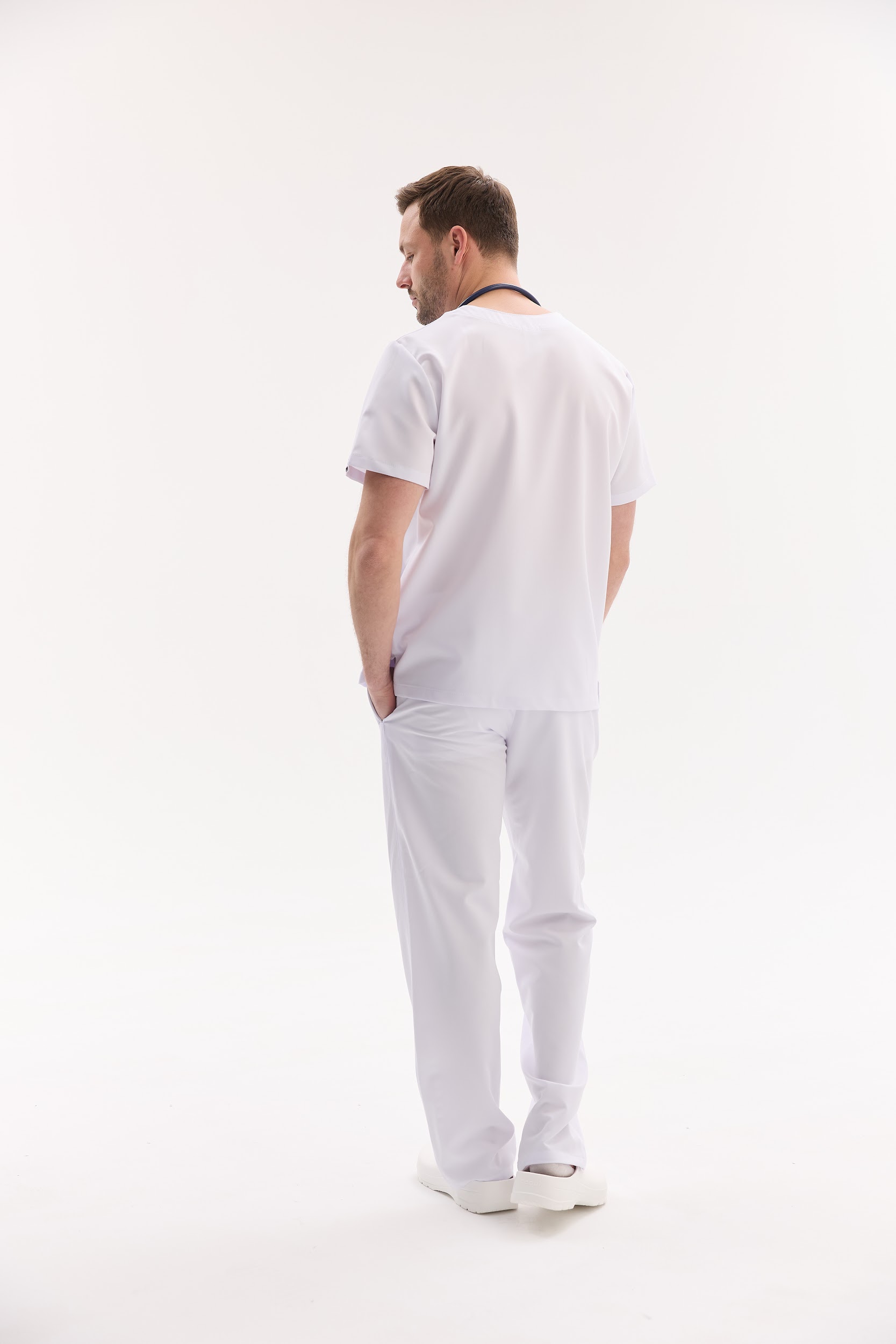 Męski strój o luźnym kroju. Koszula z krótkimi wszywanymi rękawami, dekoltem w kształcie litery V i kieszeniami w szwach reliefowych. Spodnie o prostym kroju, z kieszeniami w szwach.