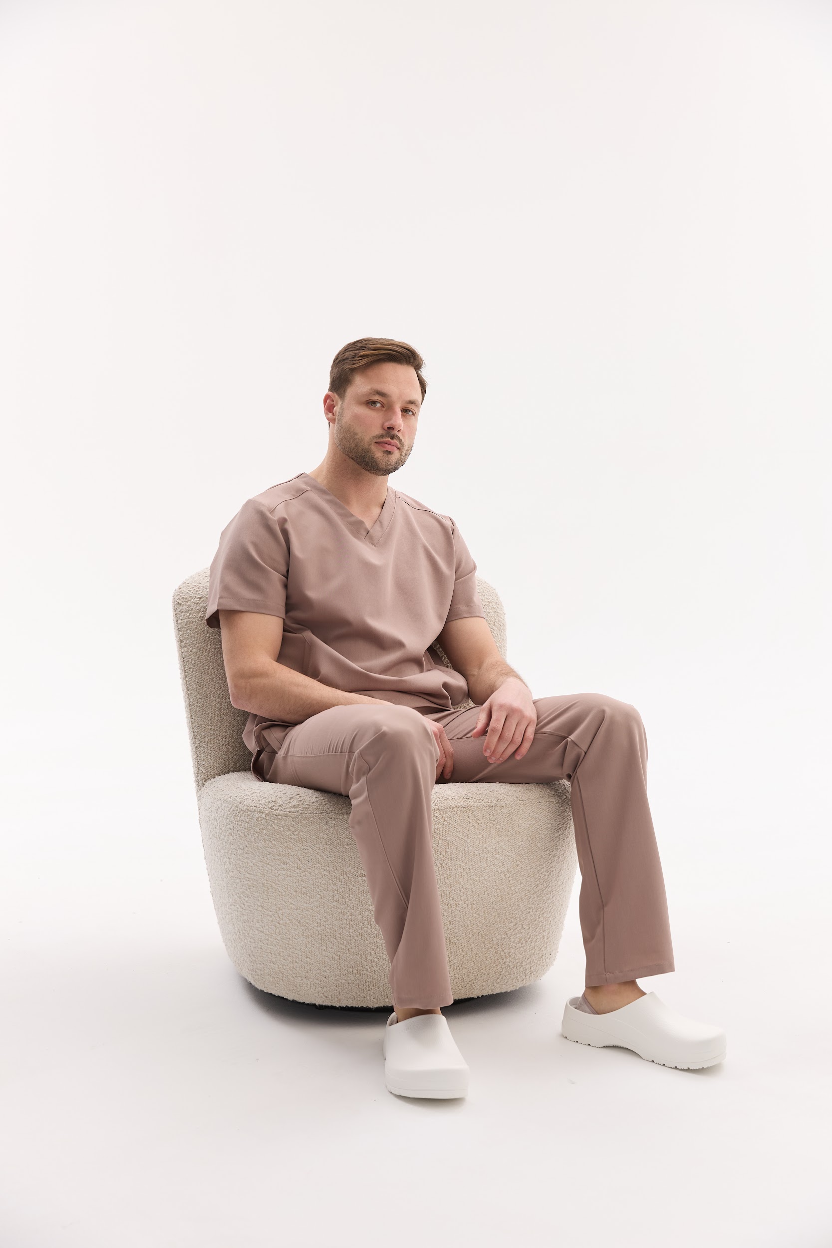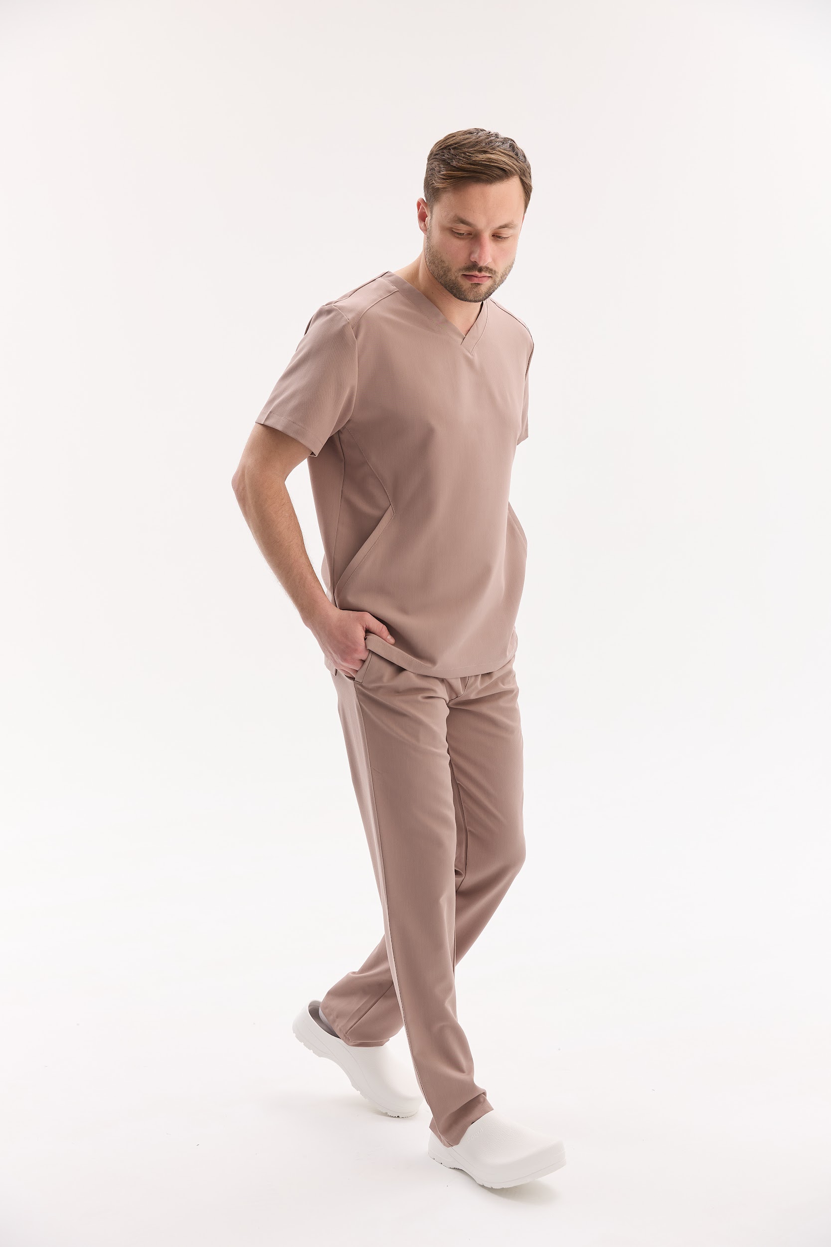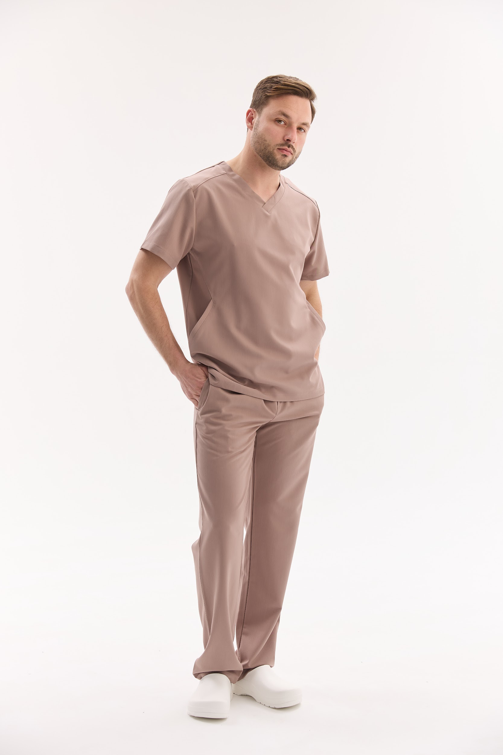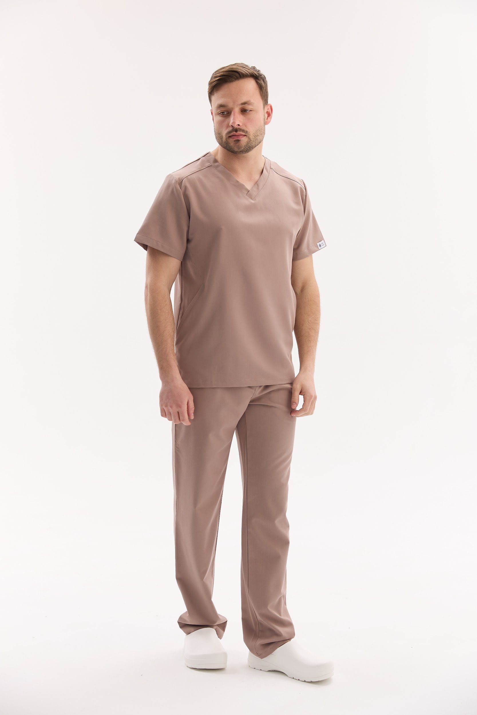 Męski strój o luźnym kroju. Koszula z krótkimi wszywanymi rękawami, dekoltem w kształcie litery V i kieszeniami w szwach reliefowych. Spodnie o prostym kroju, z kieszeniami w szwach.