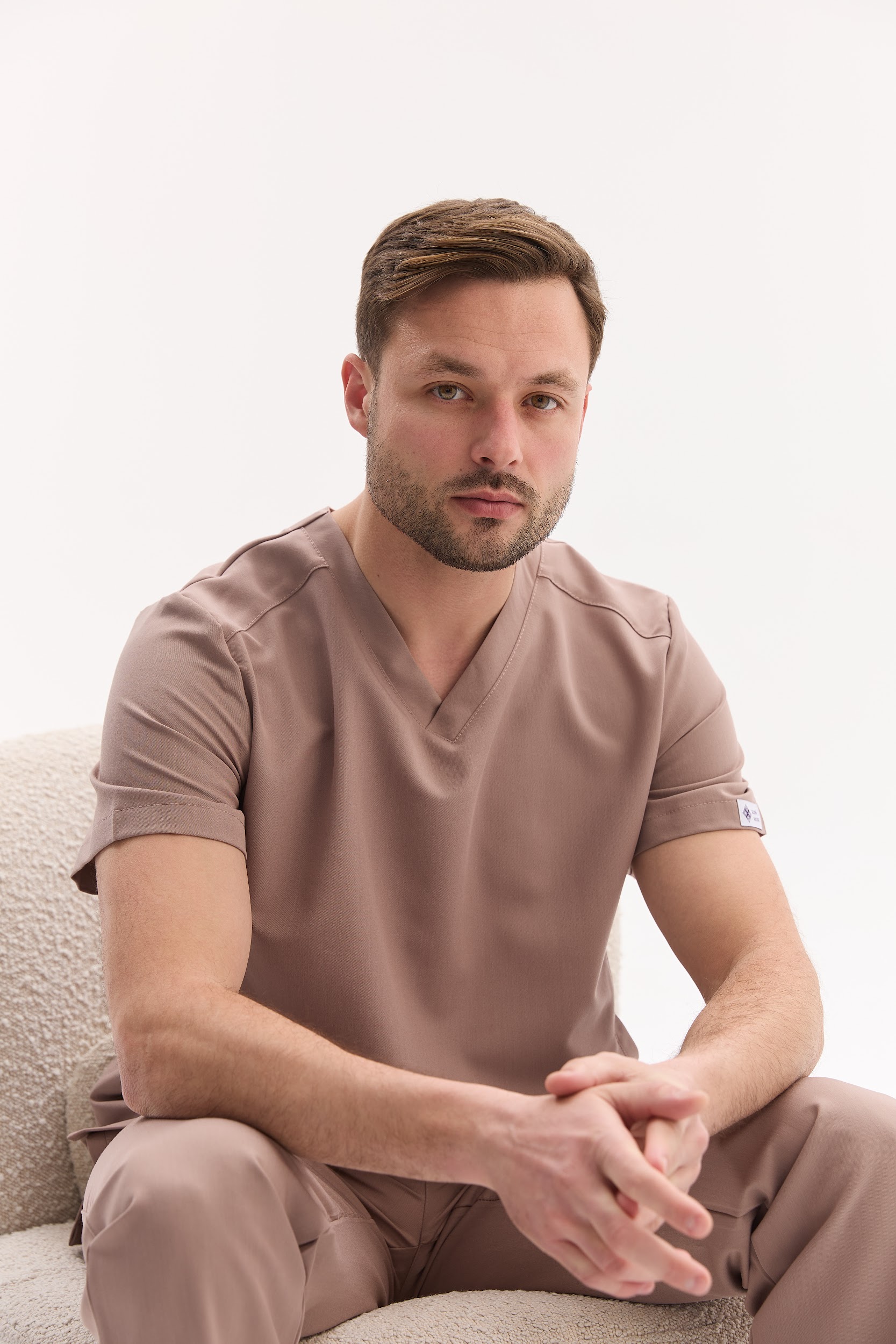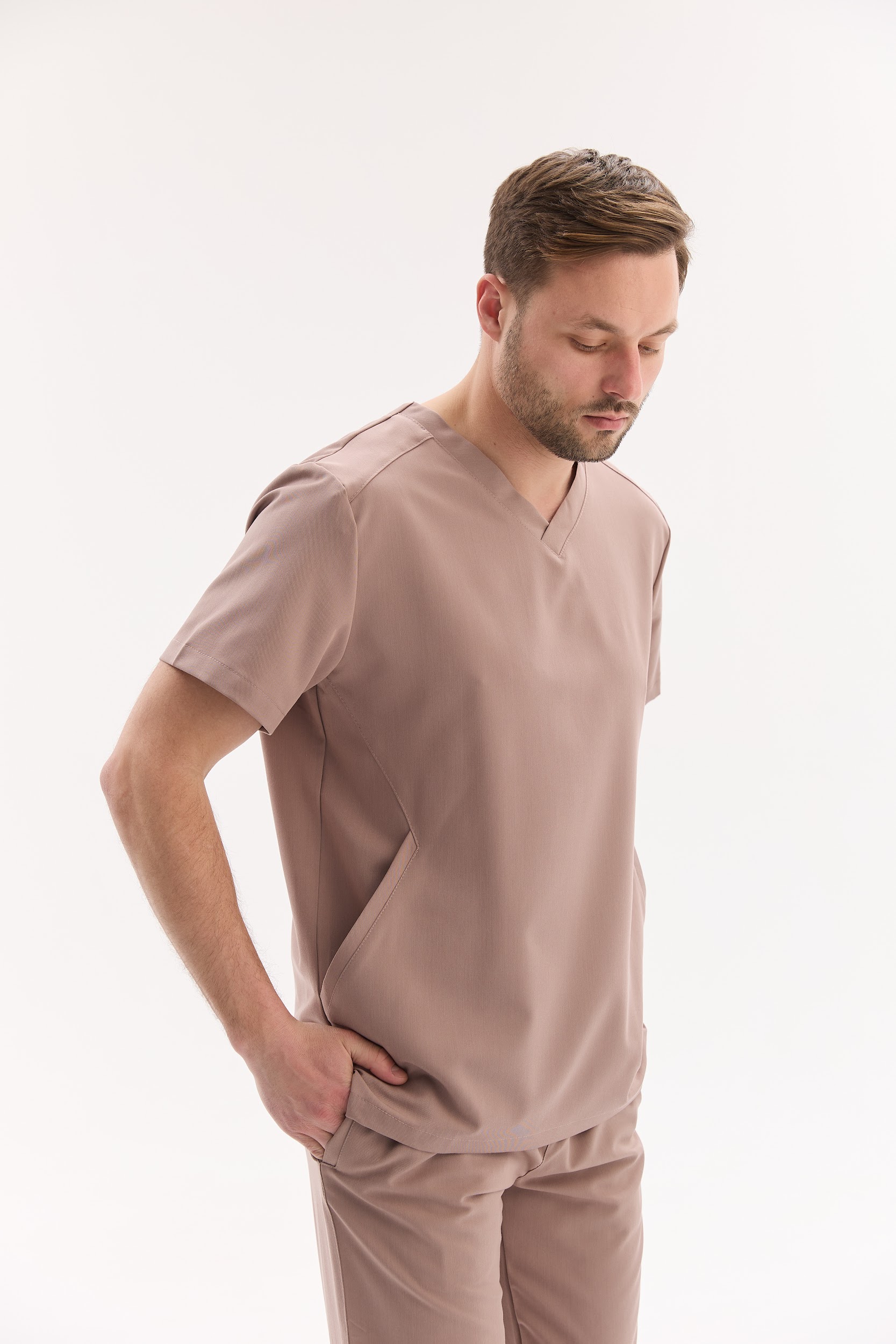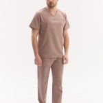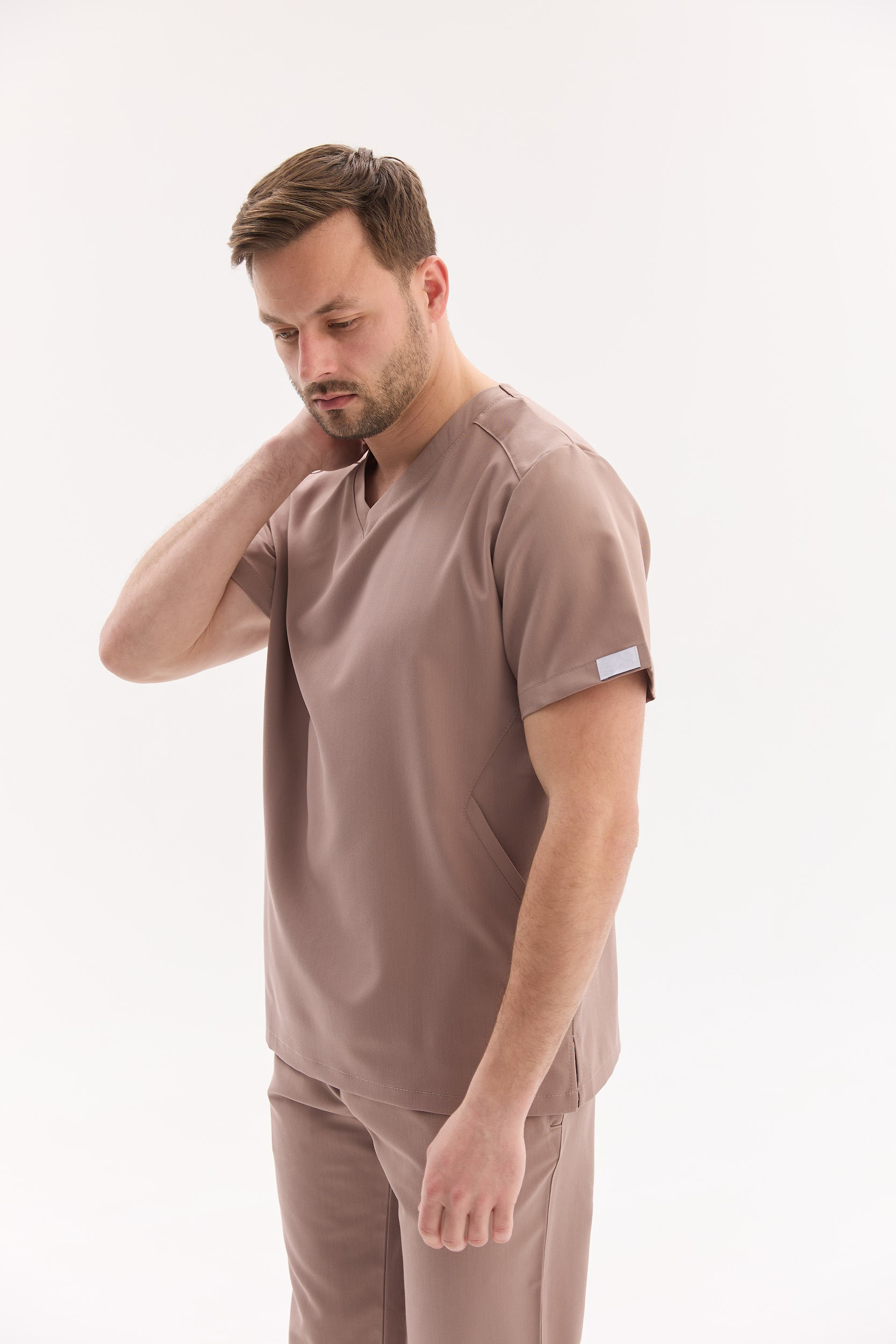 Męski strój o luźnym kroju. Koszula z krótkimi wszywanymi rękawami, dekoltem w kształcie litery V i kieszeniami w szwach reliefowych. Spodnie o prostym kroju, z kieszeniami w szwach.