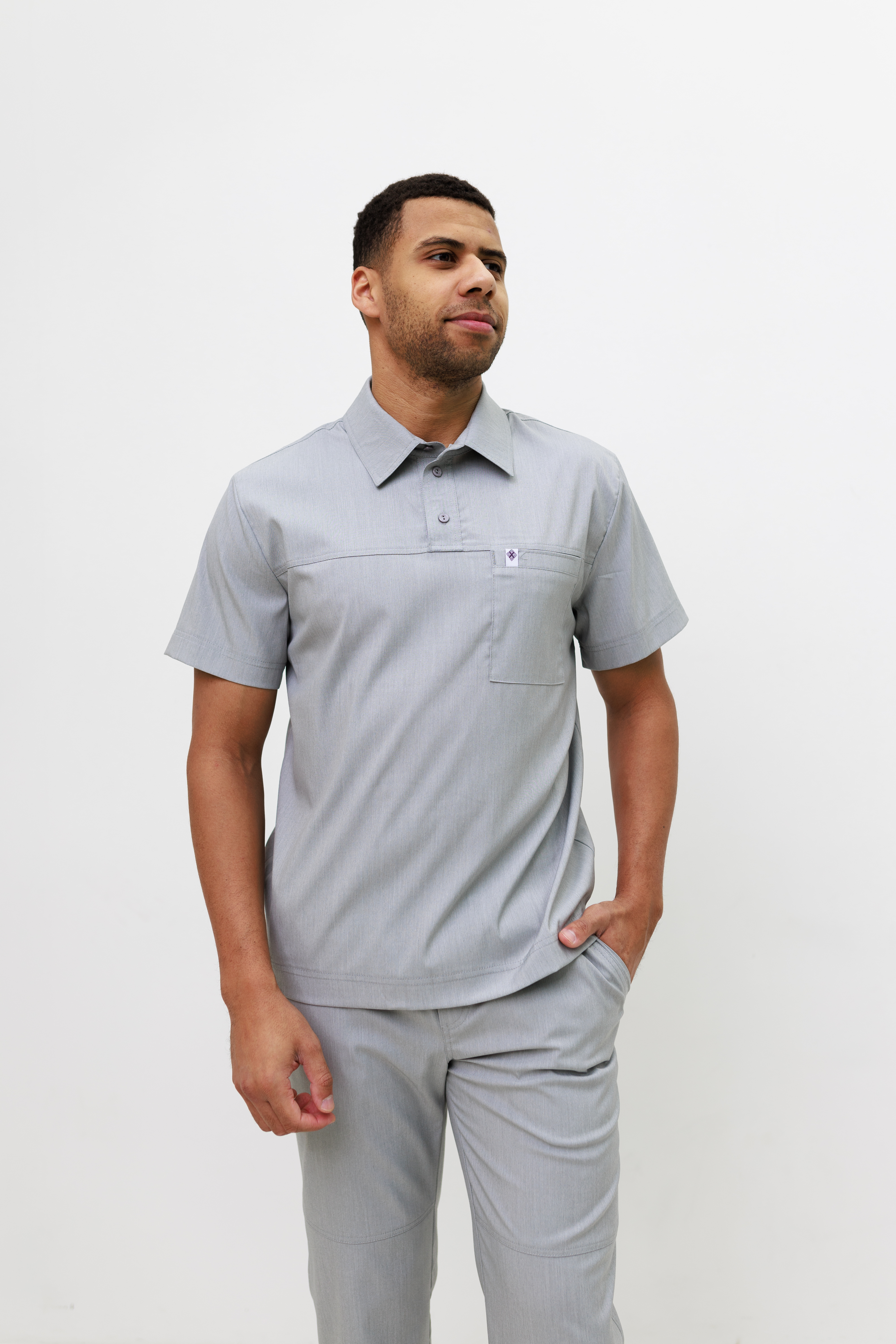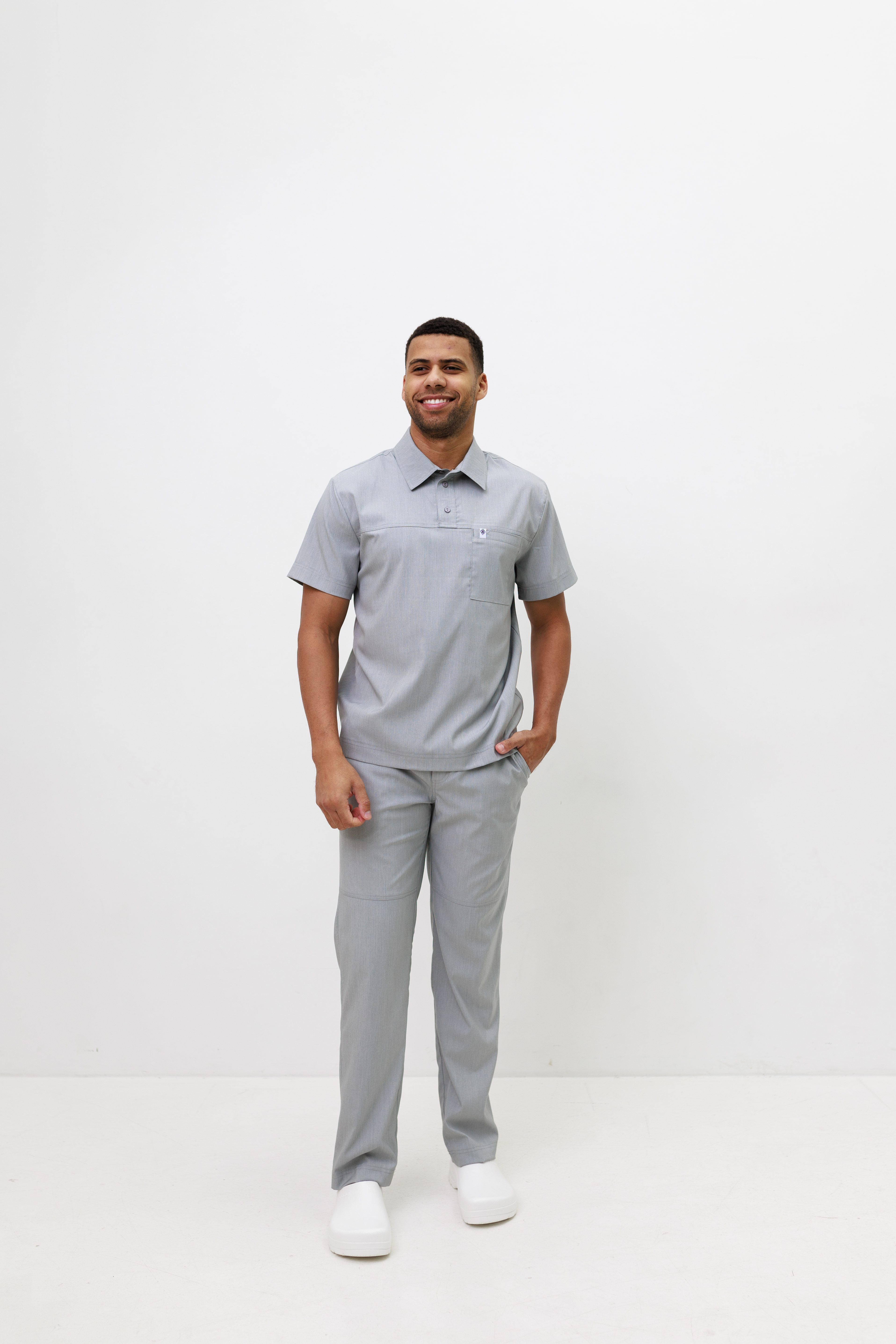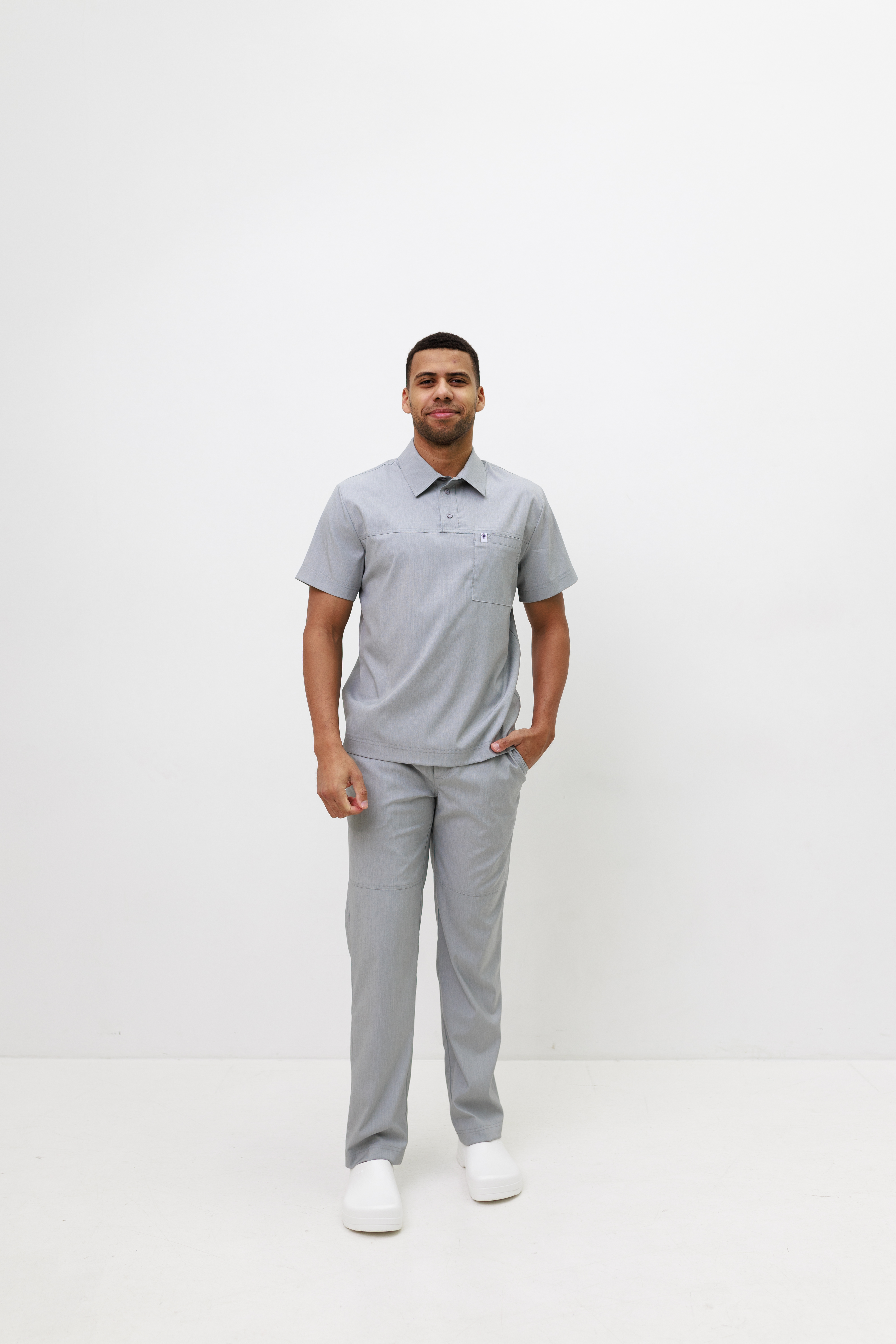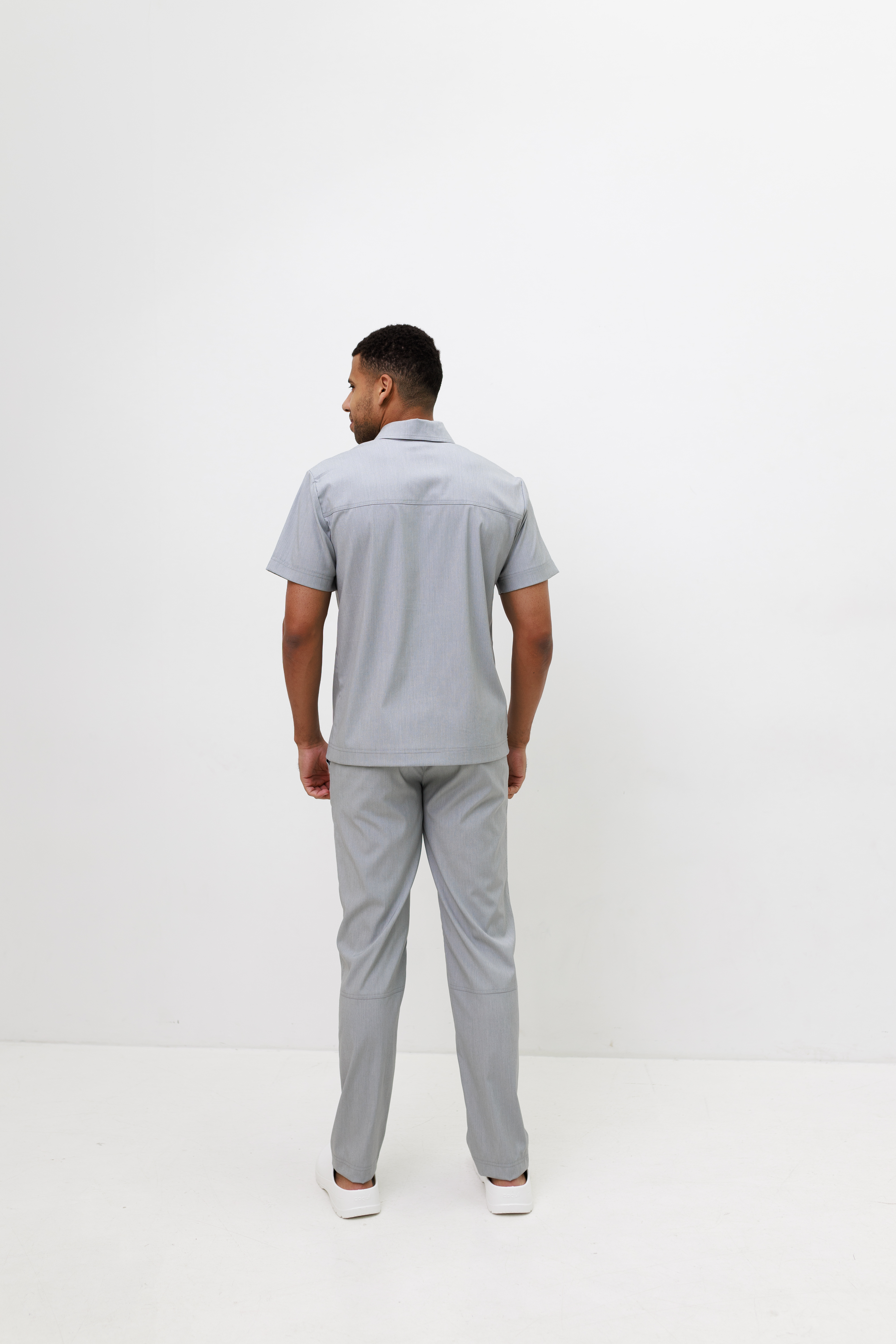 Męski strój o luźnym kroju. Koszula z klasycznym kołnierzykiem typu stójka i zapięciem typu polo. Po lewej stronie koszuli znajduje się naszyta kieszeń, która po praniu staje się funkcjonalna. Rękawy krótkie. Spodnie o prostym kroju, lekko zwężane. Posiadają kieszenie i dekoracyjne przeszycia.